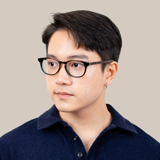 - กรอบที่มีสันคิ้ว (Browline) – ดึงสายตาขึ้นด้านบน ลดความกลมของใบหน้ากรอบทรง